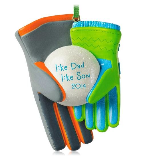 A pair of gloves, one larger (grey) and one smaller (green), hold a snowball that reads “like Dad like Son 2014″