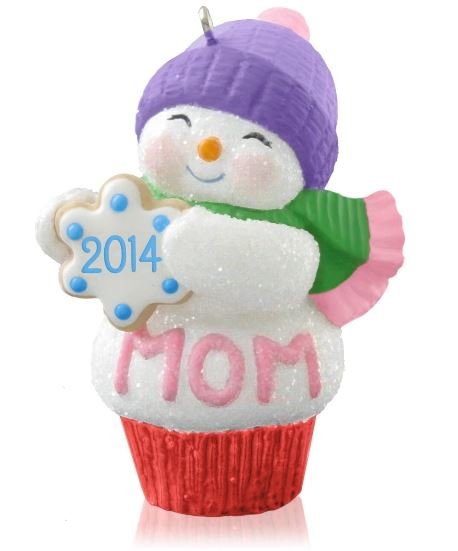 This Mom snowmoman (cupcake) is wearing a purple knit hat and is holding a snowflake sugar cookie dated 2014.