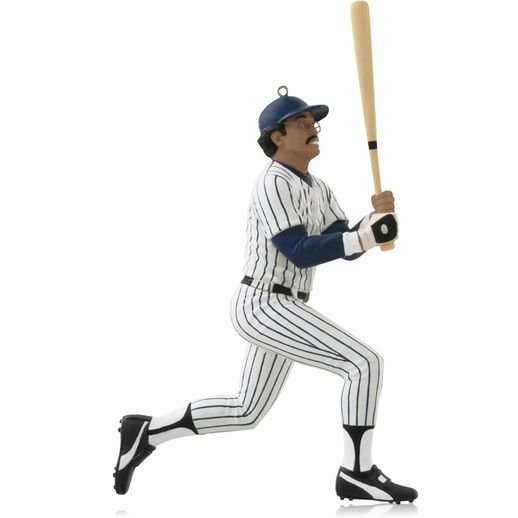 Reggie Jackson in a pin stripped baseball uniform hitting another home run. Jackson played baseball for five teams from 1967-1987. Reggie Jackson