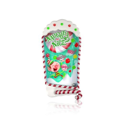 On ornament: Naughty or Nice? Nice! Nice-ish…Naughty? Take turns launching the pinball to see how you score on the nice list throughout the holiday season. Batteries included.
