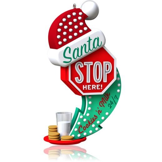 On ornament: Santa Stop Here! Cookies ?n’ Milk 24/7 Press the button on the ornament to hear a festive song parody and see lights that will guide Santa to his milk and cookies. Batteries included.