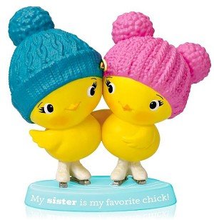 Two chicks, one with a blue hat and the other with a pink hat, together on the base, it says, “My sister is my favorite chick!” This 2014 Hallmark ornament features two yellow, ice skating chicks, with blue and pink hats.