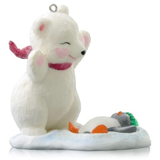 A baby polar bear named Snowball mimics a penguin, Tuxedo, who is making a snow angel. 14th in the Snowball and Tuxedo Hallmark ornament series