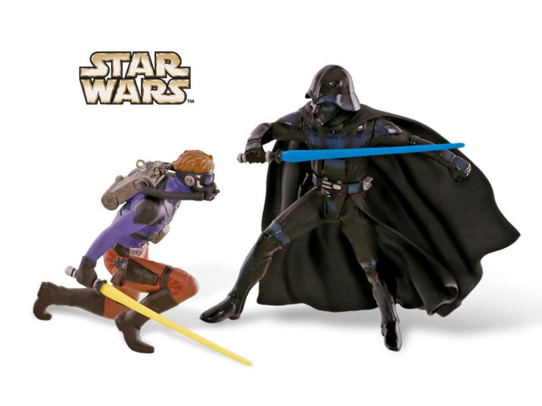 The two piece ornament set depicts an epic light-saber duel with Deak Starkiller.