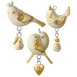 Miniature. Set of 3 ornaments. This ornament set complements others in the 12 Little Days of Christmas collection. Collect all four to create a festive holiday display! Made of Porcelain.