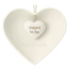 On ornament: Meant to be forever family 2016. Made of Porcelain. Arrives for Debut.