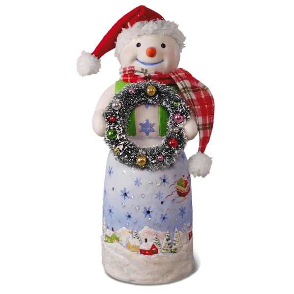 Tabletop decoration. Porcelain and fabric. Use battery-operated tea light only (included). CAUTION: Do not burn candles or tea lights in snowman.