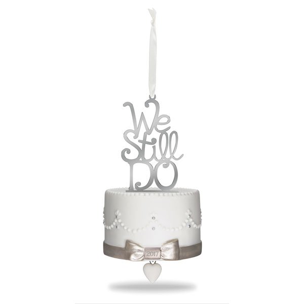 On ornament: We Still Do 2017. Numbered charms included for milestone anniversary personalization. Porcelain and metal.