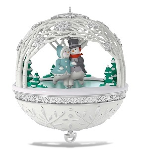 Winter Wonderland comes from the vision of Hallmark Artist Edythe Kegrize and was sculpted by fellow Hallmark Artist Robert Hurlburt. The ornate silver band and latticework of glistening trees constructed by Robert creates a delicate yet magical environment for Edythe’s snowy couple inside. Watch as they skate across a frozen pond, experiencing the wonder of winter in the company of a loved one.