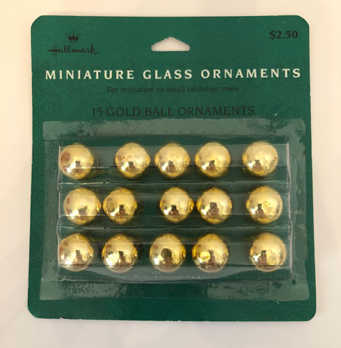 Set of 15 gold colored miniature glass ball ornaments.